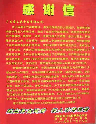 12月20日,我司员工积极到我市中心血站挽起衣袖踊跃参加无偿献血。昨日血站工作人员为我司送来了锦旗和感谢信。